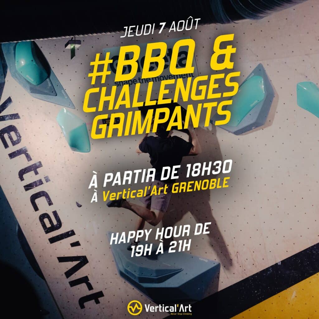 📍Rendez-vous jeudi 7 août à partir de 18h30 à Vertical’Art Grenoble pour un événement estival incontournable : #BBQ & Challenges Grimpants !