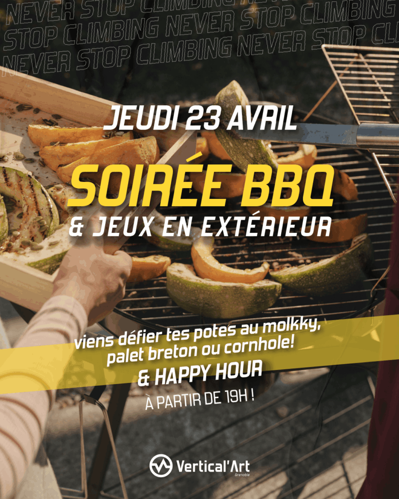 Le mercredi 23 avril, Vertical’Art Grenoble sort le barbecue et ouvre grand la terrasse ! La météo nous gâte avec des températures estivales en avance, et on compte bien en profiter. Au programme : grillades, happy hour et jeux en extérieur pour lancer la saison des beaux jours comme il se doit.